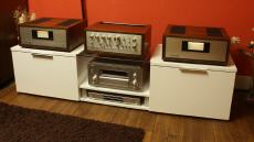 Gleiche Optik wie die Endstufe M-3, aber reiner Class-A Verstärker. Auch deutlich abgespeckte Ausstattung mit nur einem Boxenpaar ohne Pegelregelung .... Die M-4 hatte wegen der größeren Hitze-Entwicklung zwei Lüfter im Woodcase eingebaut.