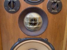 Ein Meilenstein im Boxendesign. Wunderschönes echtholzfurniertes Gehäuse mit einem Ufo-ähnlichem Verteiler des 360 Grad Bändchenhochtöners. Dazu eine solide Abdeckung mit Rauchglasscheibe.