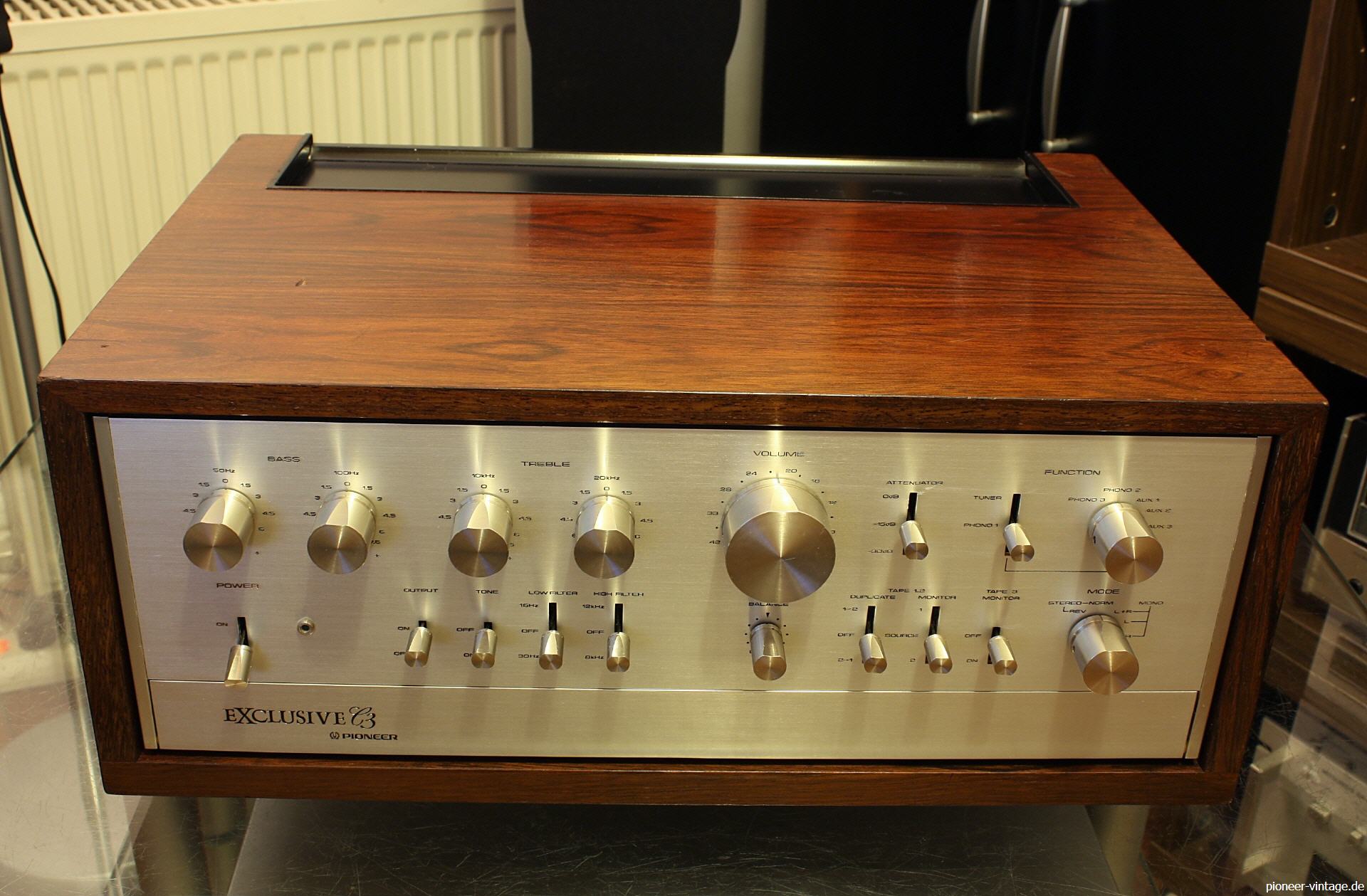 Der Vorverstärker C-3 und der Endverstärker M-3 waren die ersten Geräte von Pioneer, welche die Bezeichnung EXCLUSIVE tragen durften. Spätere Geräte dieser Serie heißen in Japan nur Exclusive, ohne den zusätzlichen Schriftzug Pioneer an der Front. Der C-3 war der Nachfolger des Spitzen-Vorverstärkers SC-3000 und kann heute noch mit den besten Vorstufen der Welt mithalten. Im Gegenteil zu vielen teuren highend 3-Knopf-Geräten, bietet der C-3 auch noch ein Top Ausstattung. Dadurch steht auch dem Hörgenuß von nicht erstklassigem Quellmaterial nichts im Wege.