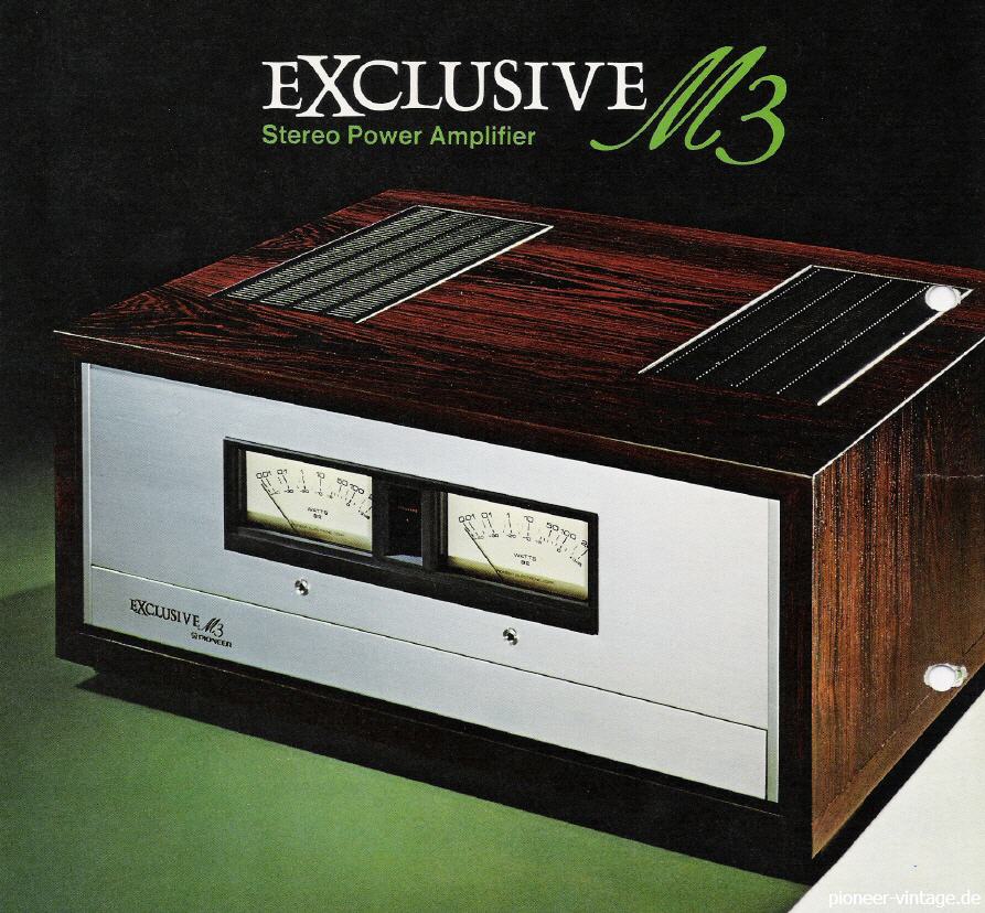Die passende Endstufe zum C-3 Vorverstärker war die M-3. Anschlußmöglichkeiten für 3 Paar Lautsprecher, je mit separater Pegelregelung. Die wunderschönen großen VU-Meter und das imposante Woodcase prägten das Design der Exclusive Endverstärker. Mit 27,5 kg wog die Endstufe noch mehr, als die 1-2 Jahre später folgende SPEC-2 aus dem "normalem" Pioneer Programm.