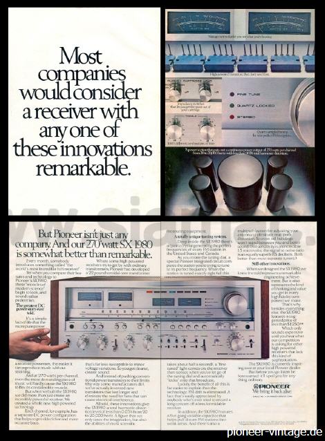 Pioneer SX-1980 - Der SX-1980 war der grösste Receiver von Pioneer. Mit 2 x 270 Watt an 8 Ohm ein wahres Monster. Ohne Frage eines der besten Vintage Receiver aller Zeiten. Einfach wunderschön, zeitlos im Design und es macht richtig Spaß, mit seinen 2 grossen VU-Metern, dem SX-1980 bei der Arbeit zuzusehen. Klanglich auch top, einzig die Quarzsteuerung des Tuners funktioniert in Europa nicht so gut. Gewicht 34,6 kg. Konkurrenten waren: Marantz 2600, Technics SA-1000, Sansui G-33000