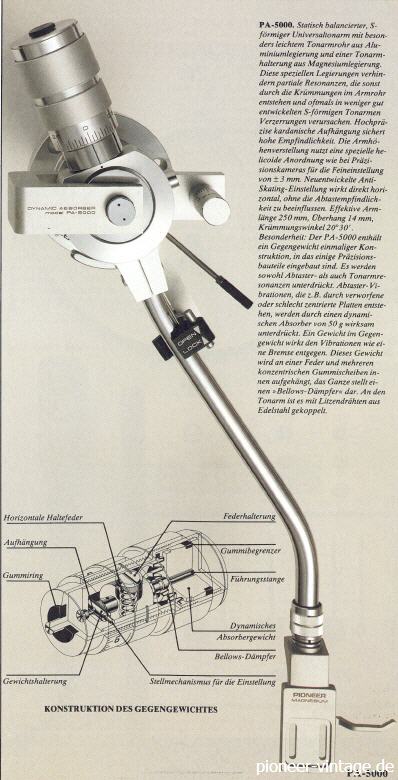 Kleinere Version der Pioneer Exclusive P3 / P10 Plattenspieler. Chassis wurde nicht so aufwendig gebaut, aber sehr ähnlicher Tonarm. Dieser ölgedämpfte und höhenverstellbare Tonarm wird mit 2 Rohren + 3 Gewichten geliefert. Ein S-Arm mir SME-Headshell + gerader Tonarm mit integriertem Headshell. Dadurch ist der Tonarm für fast jedes System einsetzbar. Besonderheit ist auch der elektronisch gesteuerte Tonarmlift, der eine zusätzliche Endabschaltung ermöglicht.